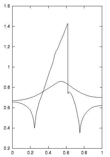 Distribution of Mach number along walls Detail of the triangulation Detail of the isolines of Mach number Distribution of the Mach number along walls. Detail of the mesh near the shock wave Detail of the isolines of Mach number near the shock wave
