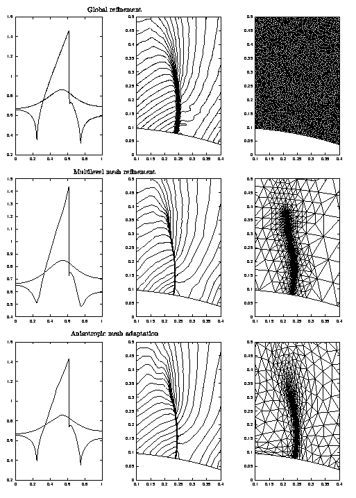 Distribution of Mach number along walls, details of isolines of Mach number and triangulations near the shock wave.