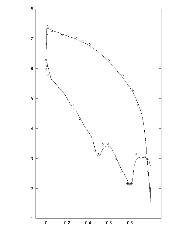 The distribution of the pressure along the profile (full line) in comparison with the experimental data (separated nodes) presented in [1].