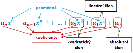 Čísla \(a_0, a_1, \cdots , a_n\) se nazývají koeficienty mnohočlenu, sčítanci