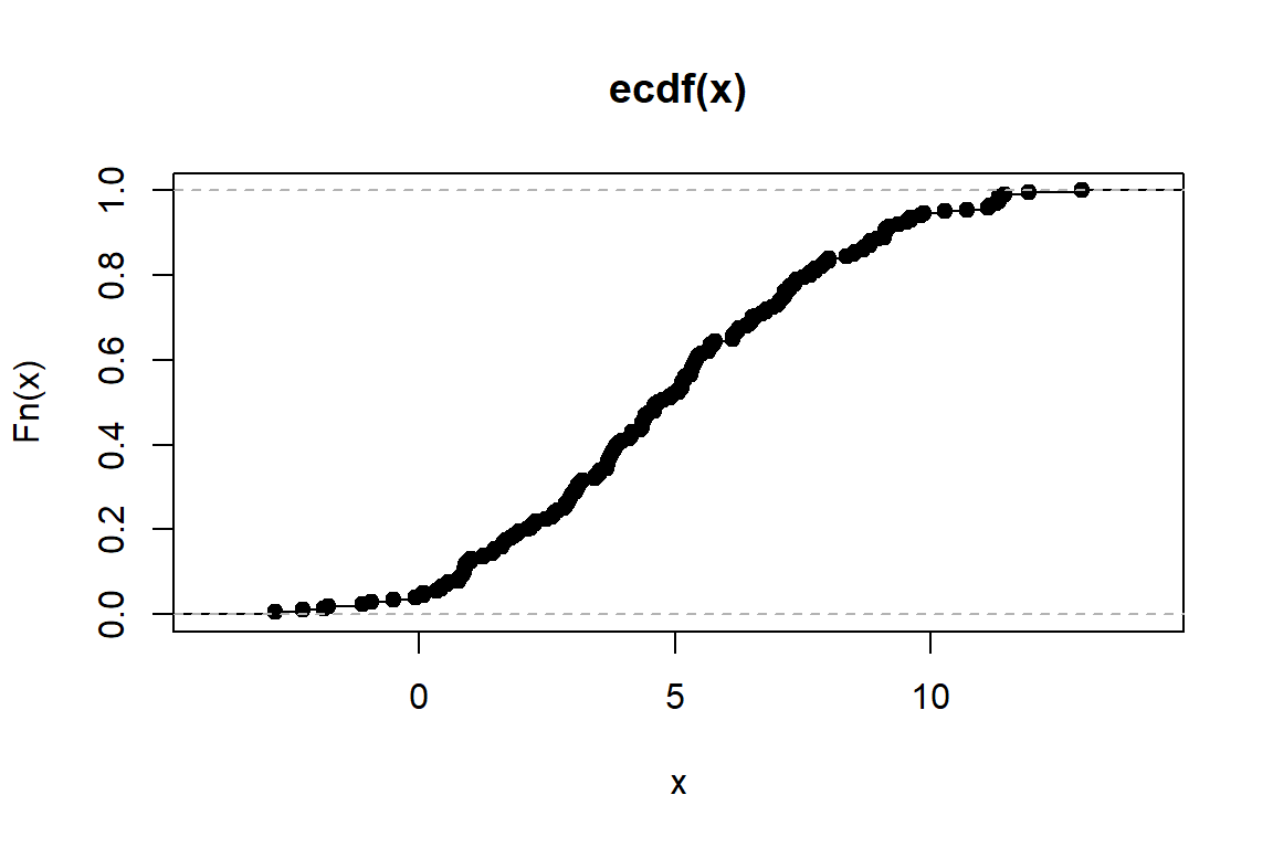 Fx <- pnorm(x, mean = 5, sd = 2) # distr. fce ve zvolených hodnotách
