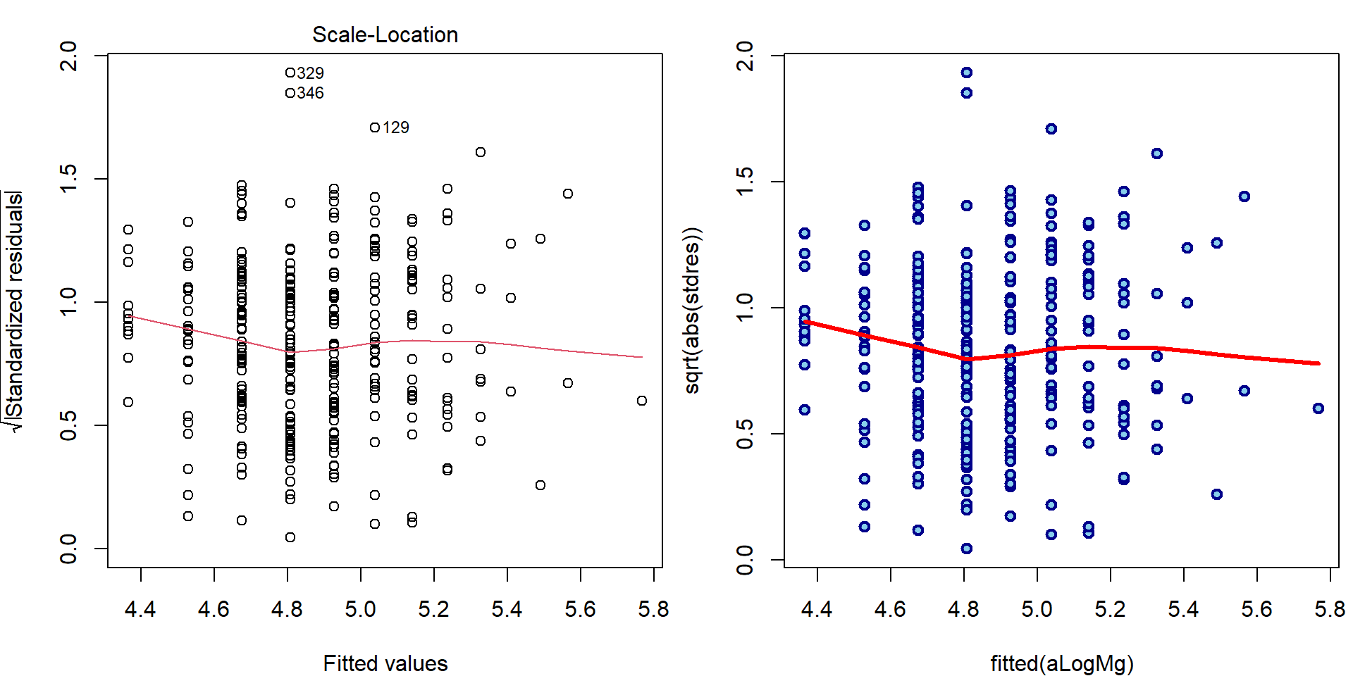 lines(lowess(fitted(aLogMg), sqrt(abs(stdres))), col="red", lwd=3)