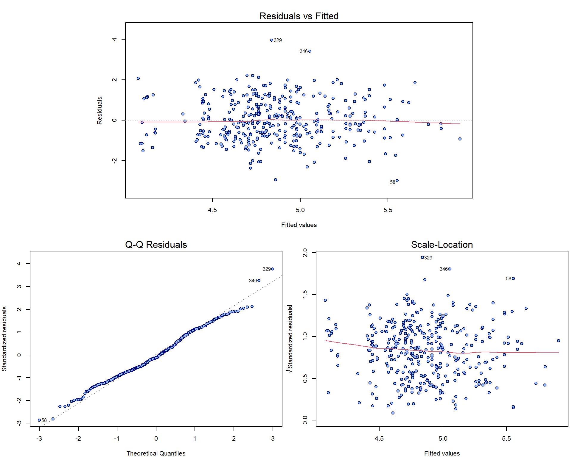 It seems there is some issue with homoscedasticity assumption. Let’s change the x-axis of the third Scale-Location plot to determine how the variability changes: