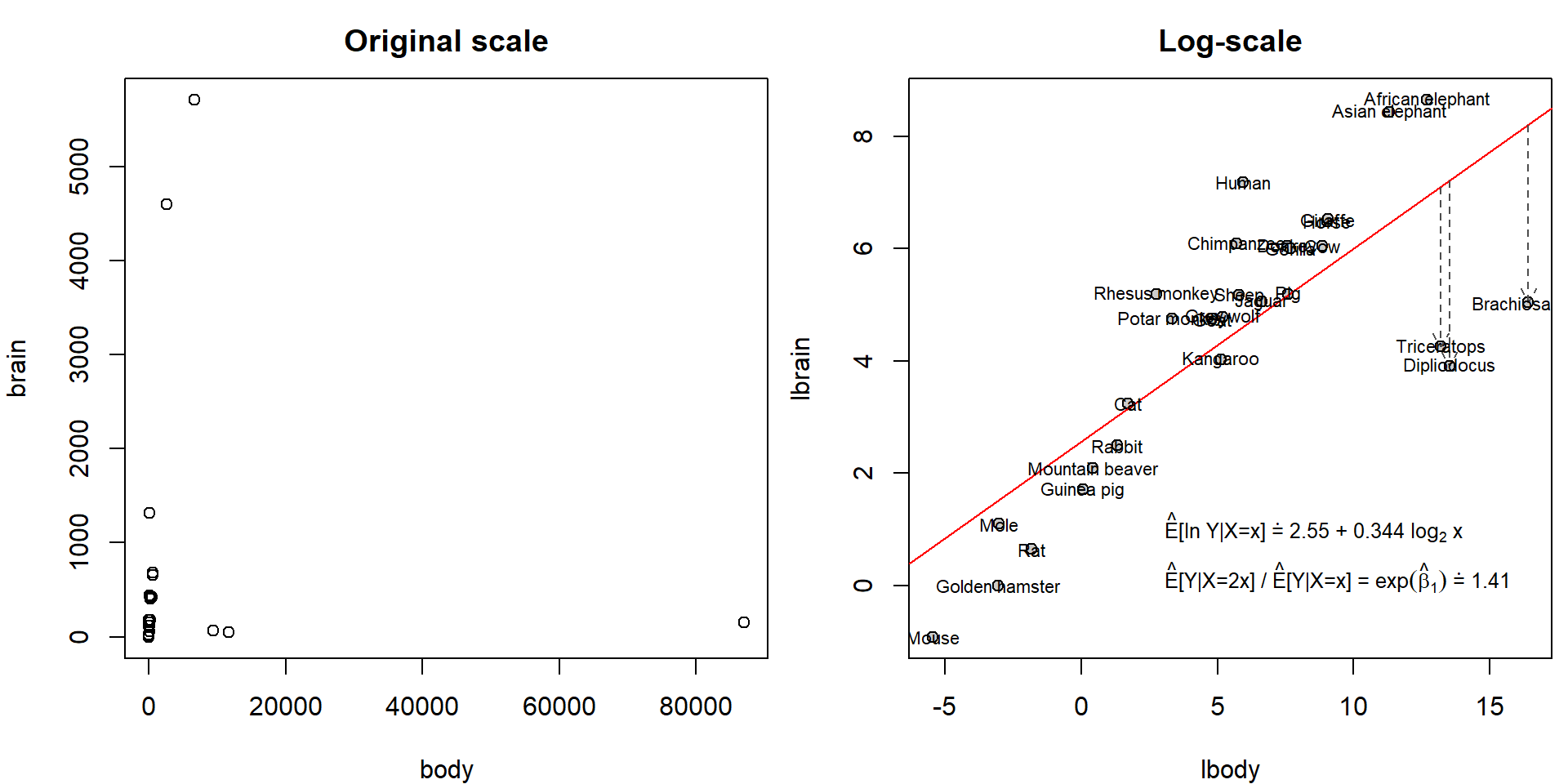xlab = expression(Log[2](body)~"["~log[2]~"(kg)]"), ylab = "Ln(brain) [ln(g)]")