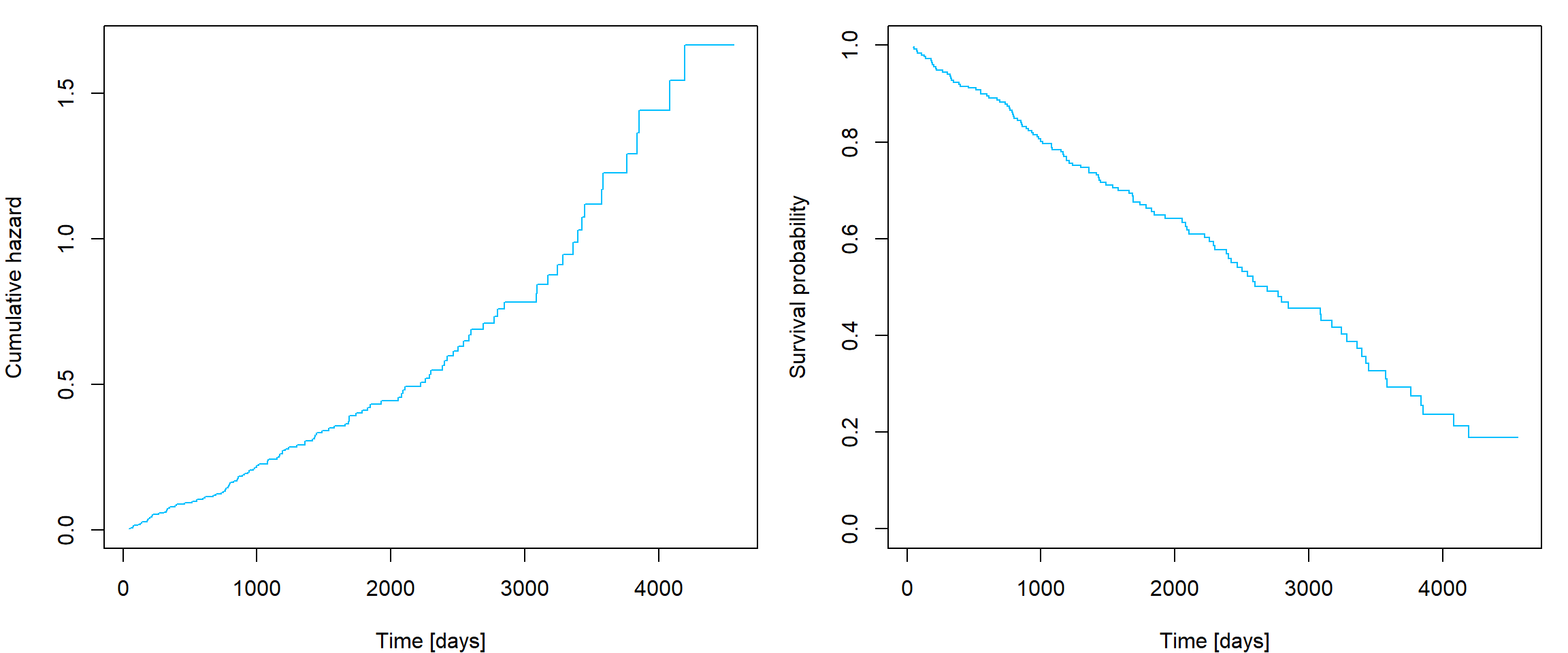 plot(lL1 ~ fit[1]$time, col = "blue", type = "s", xlab = "Time [days]", ylab = "Log-cumulative hazard")