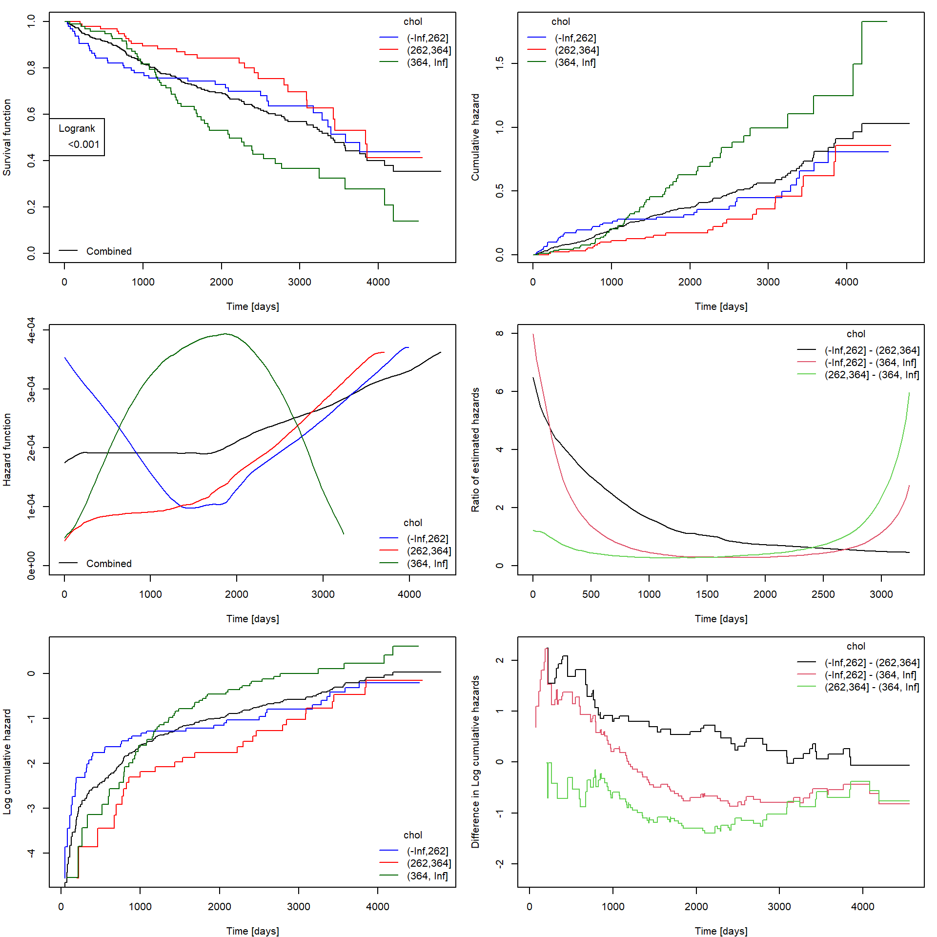 #check.coxph(fit, var = "chol", type = "continuous", ngroups = 3)