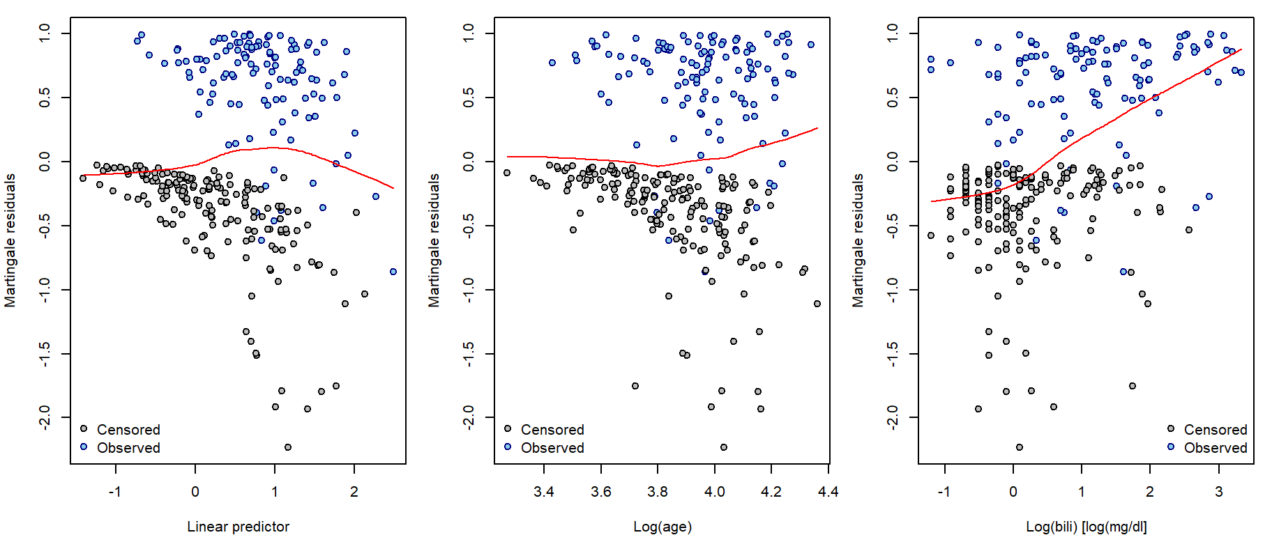 xlab = "Log(bili) [log(mg/dl]", ylab = "Martingale residuals",